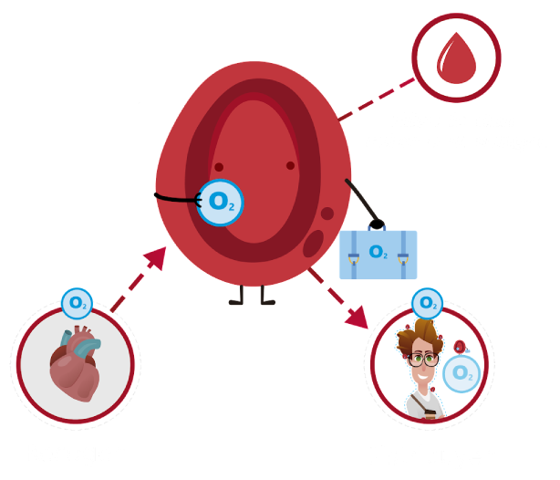 Los glóbulos rojos viajan por el cuerpo, van al corazón y a los pulmones, donde recogen del aire el oxígeno que respiramos y luego lo distribuyen a todos los lugares del cuerpo. A su vez, recogen el oxígeno ya utilizado, el cual se ha convertido en dióxido de carbono para que sea expulsado y así el cuerpo no se intoxique. Ellos le dan el color a la sangre por medio de la hemoglobina, la cual es producida por el sistema hematopoyético con ayuda del hierro que es un mineral que viene en alimentos como el frijol, lentejas, espinaca, hígado, carne, entre otros.